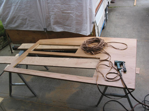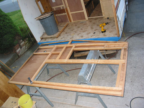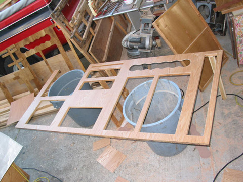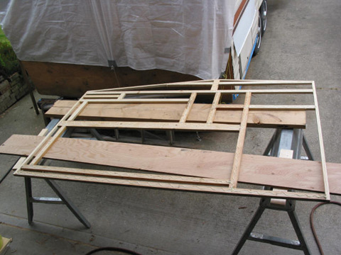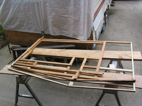 Main wall partition: This one separates the bathroom from the rest of the trailer. This one was tough to rebuild. The old one was so rough, it had fallen apart in several places. Bench seat and bed bottom: This is actually the first one I did. It was easy because nothing else has to line up with it. Pardon the piles of stuff - gotta store it somewhere!