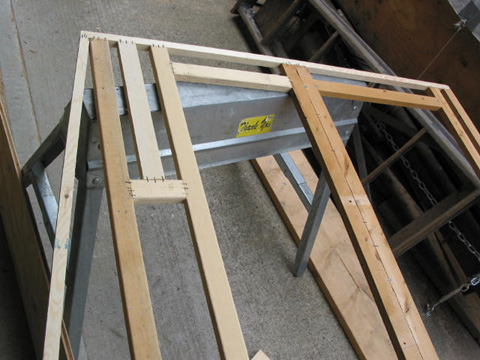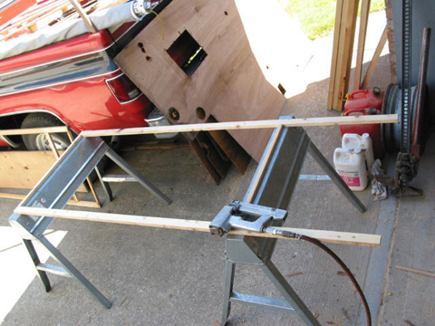 Wardrobe cabinet: New one on the sawhorses - old one on the concrete leaning against the sawhorses. Center stile in the old one was warped like a banana 3/4" in the middle.