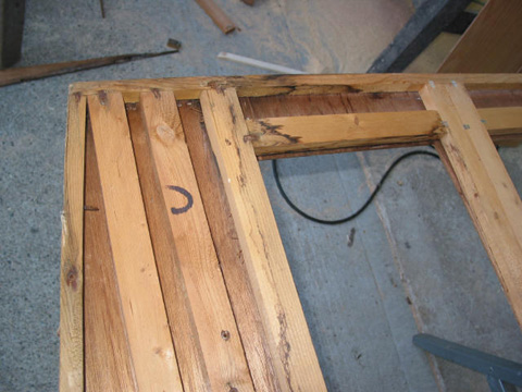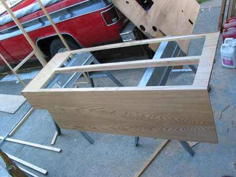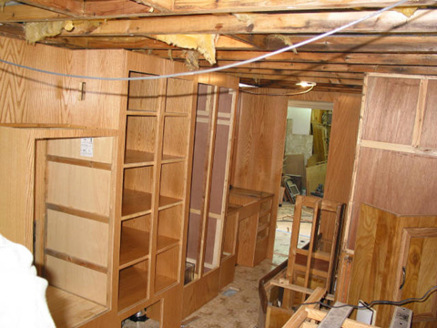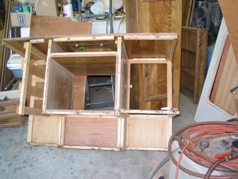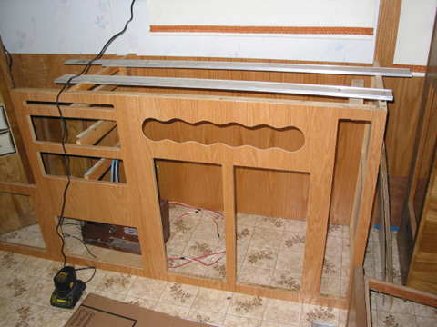 Front of main kitchen cabinet: And there it is after many hours of scraping old glue and paneling off. Had to replace about 1/4 of it for rot.