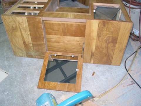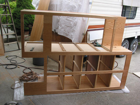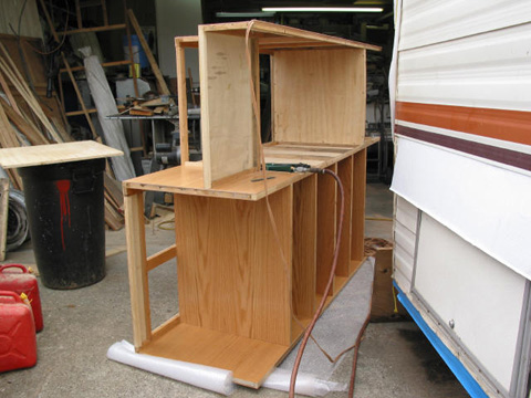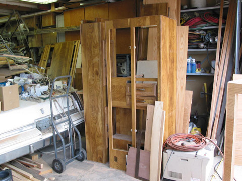 Largest cabinet with fridge opening: Mostly finished with new facing, shelves and paneling. Yes, that is an Oldsmobile under all those trailer parts!