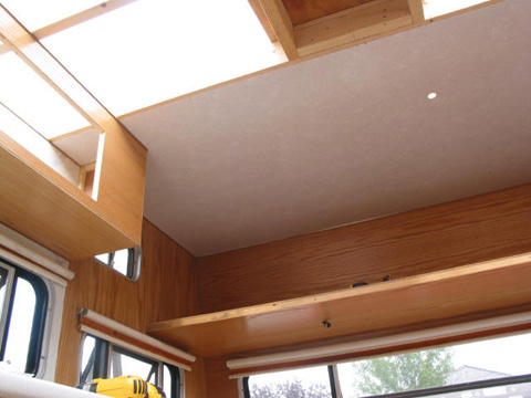 Design flaw correction: Same correction as the front. I was only able to do one rafter here due to the vent location. First ceiling panel: Its been a long time coming but the first ceiling panel is finally in. First ceiling panel: Same thing as viewed a little further back. RV rubber roof can essentially be leak-proof for about 30 years. Installing second panel: Here's how I get them in - lift the roof up onto blocks and slide the panel in between the wall and the roof. Cutouts for wires etc. were calculated and done first. Gluing the panels up: I used PL Premium panel adhesive to hold the panels in place. From the inside I used decorative brass colored nails in a grid pattern. The joints are stapled as they will be covered.