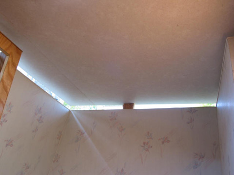 Holding the panel up: I used a couple pieces of 1X2 as temporary props while I positioned and fastened the panel. Bathroom ceiling: You can see the gap while the roof is still up on blocks on top of the walls. Bedroom ceiling: This is above the main bed area. All work, text, and photographs courtesy of Bob Hanover |
