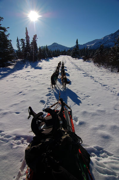 Image shows huskies pulling a sled during the winter. The sled dogs have always been part of the park experince. They are indespinsivbke. The dogs help rangers patrol much of the two-million acres of wilderness where mechanized vehicles are prohibited. The dogs of Denali help contact winter visitors, transport wildlife researchers, haul supplies, and insure no illegal activities are happening in the park, like poaching or snow machines entering into the wilderness area. These are the only sled dogs in the United States that help protect a national park and technically work for the goernment. Denali National Park and Preserve staff typically has 28 to 30 dogs at it's disposal. The Alaskan husky is the primary dog of choice here because of the indomitable game they posses to pull. They have a thick two-layer coat of fur, long legs, and a great personality so they are ideal for this harse cold land. They are bred for performance rather than an AKC appearance standard and will fight wolves if necessary to protect thier pack and owners. |