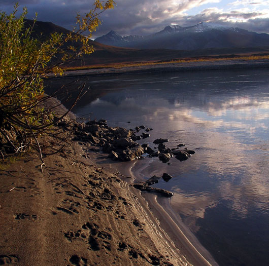 Image shows fresh grizzly bear tracks along the river. If you do encounter a bear while hiking do not run. If the bear has not seen you then quietly detour. However, if the bear is aware of you but has not acted aggressively then back away slowly. If a bear stands up then it is to identify you and is not necessarily threatening. Speak in a low, calm voice while waving your arms slowly above your head. Keep your backpack on at all times as this can protect you if he does attack. Defensive aerosol sprays containing red pepper extract have been used as an alternative for protection against bear attacks. |