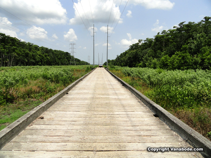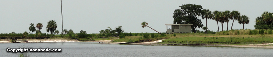 Vanabode parked on the elevated wooden road bridge used in the area to get to the fishing and boating parts of the preserve on the St. John River in the picture above. This mother alligator was in this tiney pond about 20 foot by 14 foot in the middle of nowhere. We approached the pond because we heard the baby alligaotr peeping. As soon as we got close she shower herself and would have attacked had we got too close. There was no water that we could see for at least a half mile around so they were water bound at this point. We say pig tracks so she may be feeding on young swine. There are lots of horses running around to play with or chase or photograph from nearby ranches that have grazing rights on the reserve. Here you see the power line road that runs many miles throught the reserve and deadends into the Saint Johns River. Bring lots of water here because there are very few facilities to get more unless you have a good purification system. Winter is the best time to visit Tosohatchee Wildlife Management Area in Florida. More information on the Tosohatchee Wildlife Management Area.