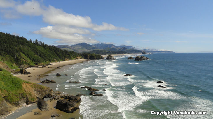 Pacific City - Tide pools are great here. Heading north take the 35 mile byway off US 101 named Three Capes Loop between Neskowin and Tillamook is considered to be the preeminent scenic area on the north coast. While driving the loop stop at Cape Kiwanda to see the battered bluffs, Cape Lookout viewpoint, and the octopus tree at Cape Meares. In August at Cape Lookout there is blue glowing algae. It responds to pressure on the sand you can see it at night but usually on the high water line. Eat at Grateful Bread Bakery in Pacific City. Showers at Cape Lookout State Park. 32 miles to Tillamook.